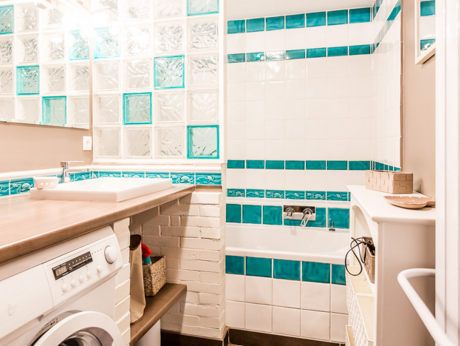 *Une salle de bains avec baignoire et lave-linge