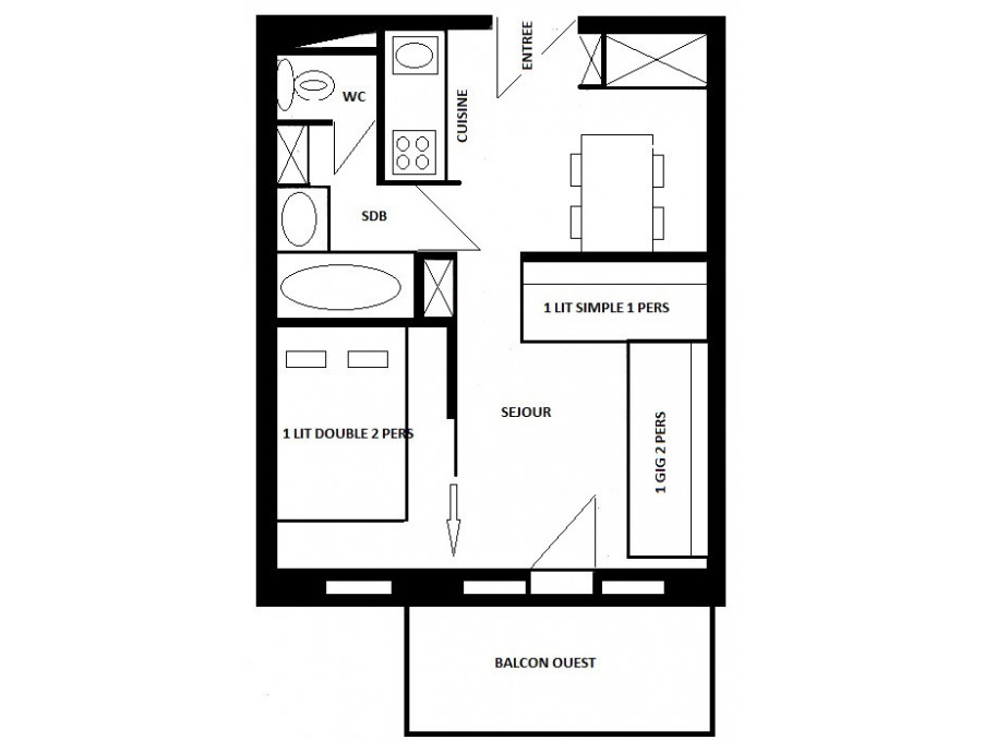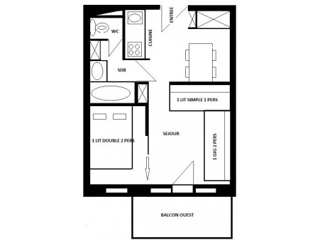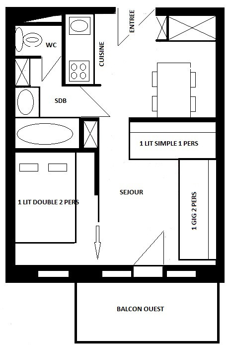 Appartement 2 pièces pour 4/5 personnes d'environ 25 m², exposé sud/ouest avec balcon, côté station au 3ème étage ; rénové récemment.